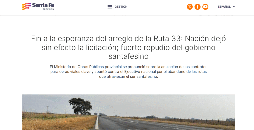 El titular alarmista del gobierno provincial –“Fin a la esperanza del arreglo de la Ruta 33”– es mucho más que una frase desafortunada: es una operación política y mediática sostenida con dinero público. El comunicado oficial del Ejecutivo santafesino presenta como una tragedia lo que en realidad es una buena noticia: el gobierno nacional dio de baja, por incumplimiento, los contratos de mantenimiento con la UTE Edeca–Rava, responsables directas del deplorable estado de la ruta. Sin embargo, desde la Casa Gris no solo defendieron a estas empresas –con fuertes vínculos con la política local–, sino que intentaron convertir a los responsables en víctimas.