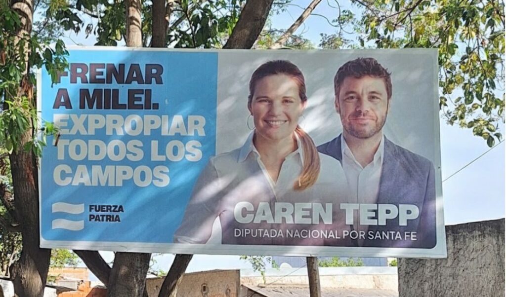 Nuevos carteles de propuestas de Caren Tepp: indultar a CFK, expropiar campos y volver a emitir