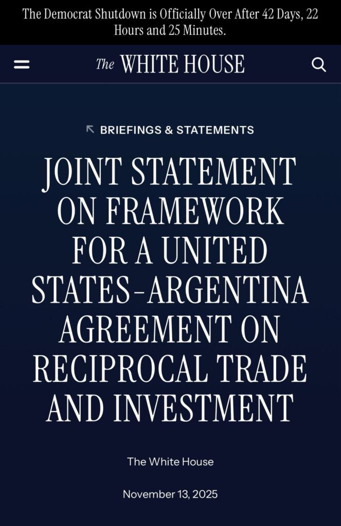El nuevo entendimiento entre la República Argentina y los Estados Unidos —firmado durante la presidencia de Javier Milei y encabezado por el canciller argentino Pablo Quirno— establece un Acuerdo sobre Comercio Recíproco e Inversiones destinado a profundizar la integración económica entre ambos países. El documento oficial de la Casa Blanca del 13 de noviembre de 2025 confirma el marco estratégico: reducción progresiva de barreras, mayor previsibilidad para inversores y una hoja de ruta para ampliar el intercambio de bienes y servicios en sectores clave.
