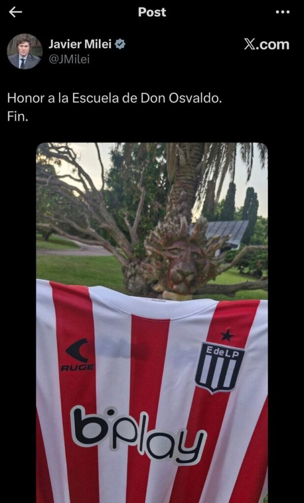 Ante ese acto, el presidente de la Nación no permaneció callado: Milei publicó en sus redes sociales un mensaje simple pero contundente: “Honor a la Escuela de Don Osvaldo.” acompañado de una imagen de la camiseta del Pincha.