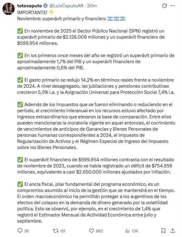 El Sector Público Nacional (SPN) de Argentina registró en noviembre de 2025 un superávit primario de $2.128.009 millones y un superávit financiero de $599.954 millones, demostrando el éxito de las políticas económicas implementadas por el gobierno de Javier Milei. Estos resultados marcan un avance significativo, ya que el superávit financiero contrasta con el déficit de $754.956 millones del mismo mes del año anterior, lo que refleja una mejora de más de $1 billón en términos reales.