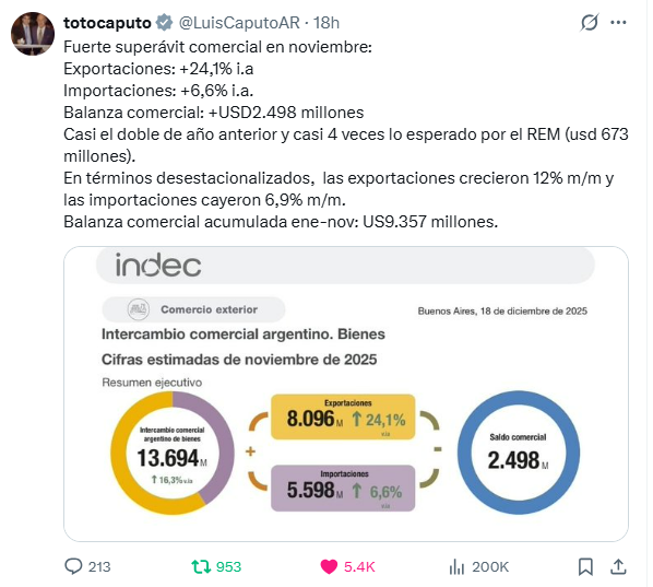 “El superávit de noviembre confirma que el programa económico está funcionando: más exportaciones, menos distorsiones y una Argentina que vuelve a generar dólares genuinos sin cepos ni parches”, afirmó el ministro de Economía, Luis Caputo, al destacar el saldo positivo de USD 2.498 millones en la balanza comercial, el más alto de todo 2025, casi el doble del registrado un año atrás y casi cuatro veces superior a lo que había anticipado el REM del Banco Central.