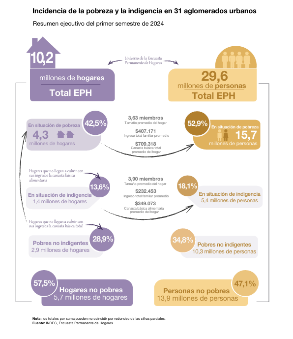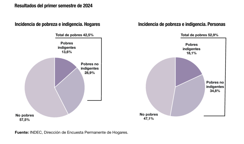 El INDEC informó que en el primer semestre de 2024 la pobreza alcanzó 52,9% de las personas y la indigencia 18,1%.