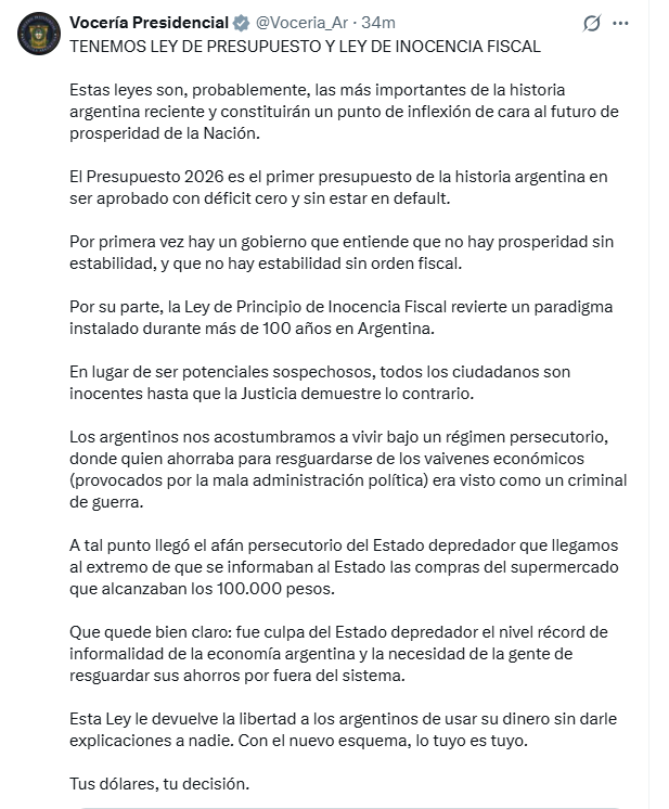 El Gobierno celebró la aprobación del Presupuesto 2026 con déficit cero y la Ley de Inocencia Fiscal, que marca un punto de inflexión tras años de despilfarro y presión tributaria bajo el kirchnerismo.