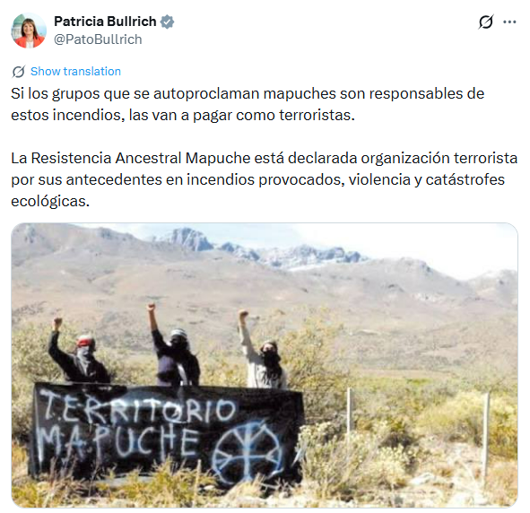“Si los grupos que se autoproclaman mapuches son responsables de estos incendios, las van a pagar como terroristas”, sostuvo Bullrich.