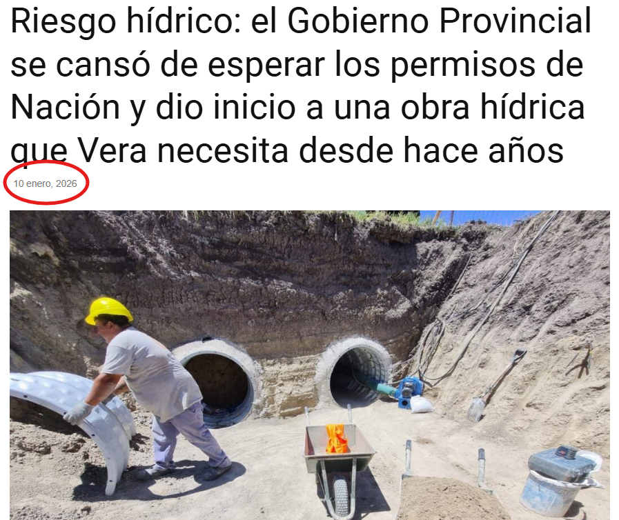 Durante el fin de semana del 10 de enero, medios alineados al Gobierno provincial difundieron una versión idéntica: que Santa Fe “se cansó de esperar los permisos de Nación” y por eso decidió iniciar una obra hídrica clave en la ciudad de Vera. El mensaje apuntó directamente contra el Gobierno nacional y buscó instalar la idea de abandono, desidia y burocracia.