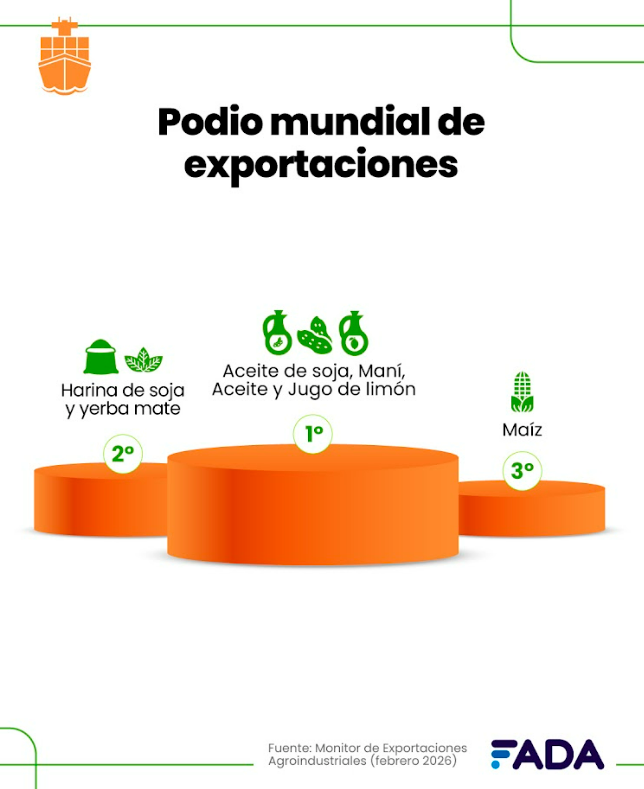 El informe muestra que Argentina ocupa posiciones de privilegio en los mercados globales. Es el principal exportador mundial de maní, aceite de soja y aceite y jugo de limón. Además, se ubica en el segundo puesto en harina de soja y yerba mate, y completa el podio internacional con el maíz.