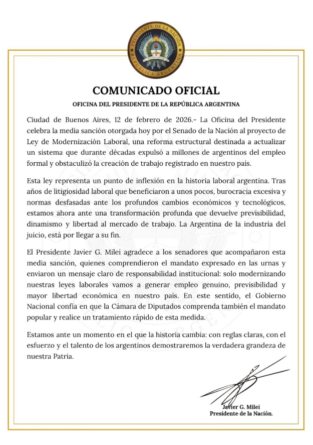 Finalizada la sesión, el presidente Javier Milei celebró el resultado y calificó la aprobación como “un punto de inflexión en la historia laboral argentina”. A través de un comunicado oficial, sostuvo que la reforma marca el final de un modelo caracterizado por la “industria del juicio” y normas obsoletas, y destacó que permitirá aportar previsibilidad y dinamismo al mercado de trabajo.