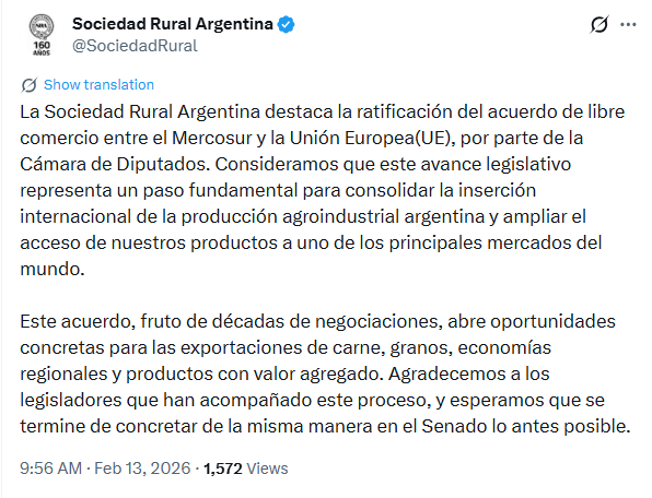 La Sociedad Rural Argentina celebra la aprobación en Diputados del acuerdo Mercosur–UE