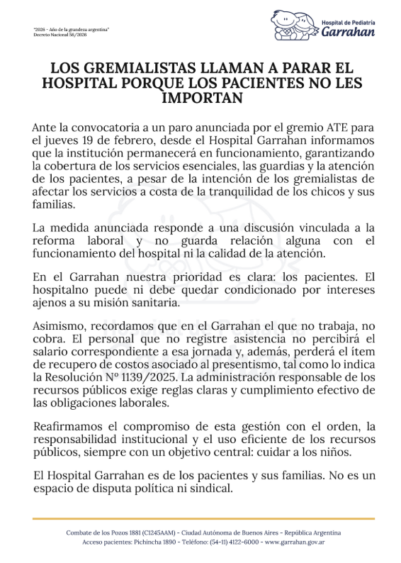 Desde el Garrahan remarcaron que la medida anunciada responde a una discusión vinculada a la reforma laboral y que “no guarda relación alguna con el funcionamiento del hospital ni la calidad de la atención”. En ese sentido, señalaron que la prioridad es clara: los pacientes. “El hospital no puede ni debe quedar condicionado por intereses ajenos a su misión sanitaria”, expresaron.