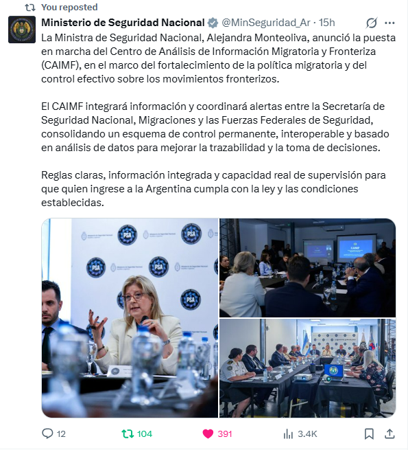 La ministra de Seguridad Nacional, Alejandra Monteoliva, encabezó el anuncio y explicó que el nuevo centro permitirá integrar información y coordinar alertas entre la Secretaría de Seguridad Nacional, la Dirección Nacional de Migraciones y las Fuerzas Federales, con el objetivo de actuar de manera anticipada y estratégica ante posibles riesgos.