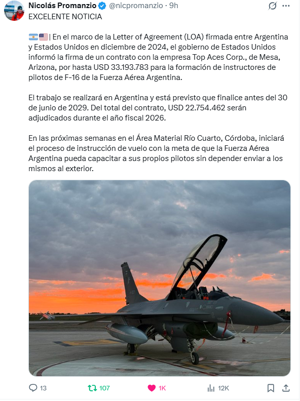 En el marco del proceso de modernización militar impulsado por el gobierno de Javier Milei, la Argentina dio un paso estratégico para consolidar la recuperación de su capacidad de defensa aérea: el gobierno de Estados Unidos confirmó la firma de un contrato con la empresa Top Aces Corp. por hasta USD 33.193.783 para la formación de instructores de pilotos de F-16 de la Fuerza Aérea Argentina.