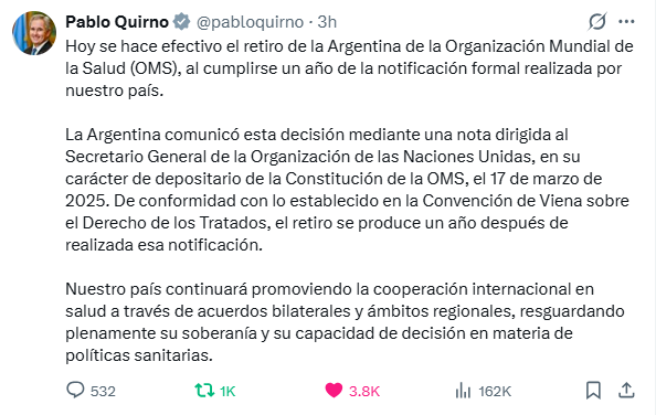«Hoy se hace efectivo el retiro de la Argentina de la Organización Mundial de la Salud (OMS), al cumplirse un año de la notificación formal realizada por nuestro país. La Argentina comunicó esta decisión mediante una nota dirigida al Secretario General de la Organización de las Naciones Unidas, en su carácter de depositario de la Constitución de la OMS, el 17 de marzo de 2025», escribió.