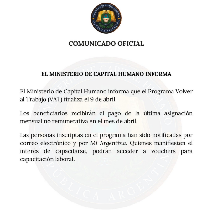 El Ministerio de Capital Humano, conducido por Sandra Pettovello, confirmó este martes lo que venía anticipando desde el inicio de la gestión: el programa Volver al Trabajo (VAT) finaliza el 9 de abril de 2026. Los 937.132 beneficiarios recibirán su última asignación mensual no remunerativa de $78.000 en el mes de abril y, a partir de entonces, quienes quieran seguir recibiendo apoyo del Estado deberán dar un paso adelante: inscribirse en el nuevo sistema de vouchers de capacitación laboral.