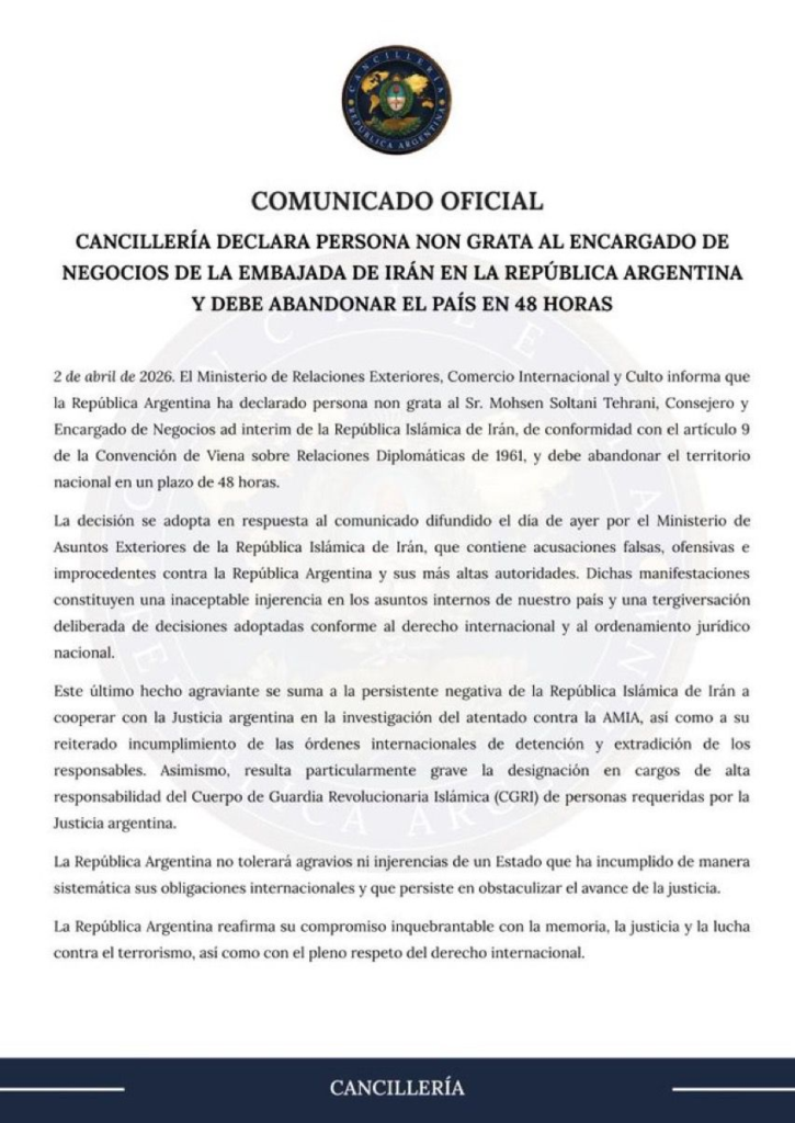 La decisión de expulsar al diplomático fue comunicada oficialmente días antes por el canciller Pablo Quirno, quien confirmó que la medida ya había sido notificada a la representación iraní en Buenos Aires. Según trascendió, la determinación se enmarca en una evaluación política y estratégica del vínculo bilateral, en un contexto internacional delicado.