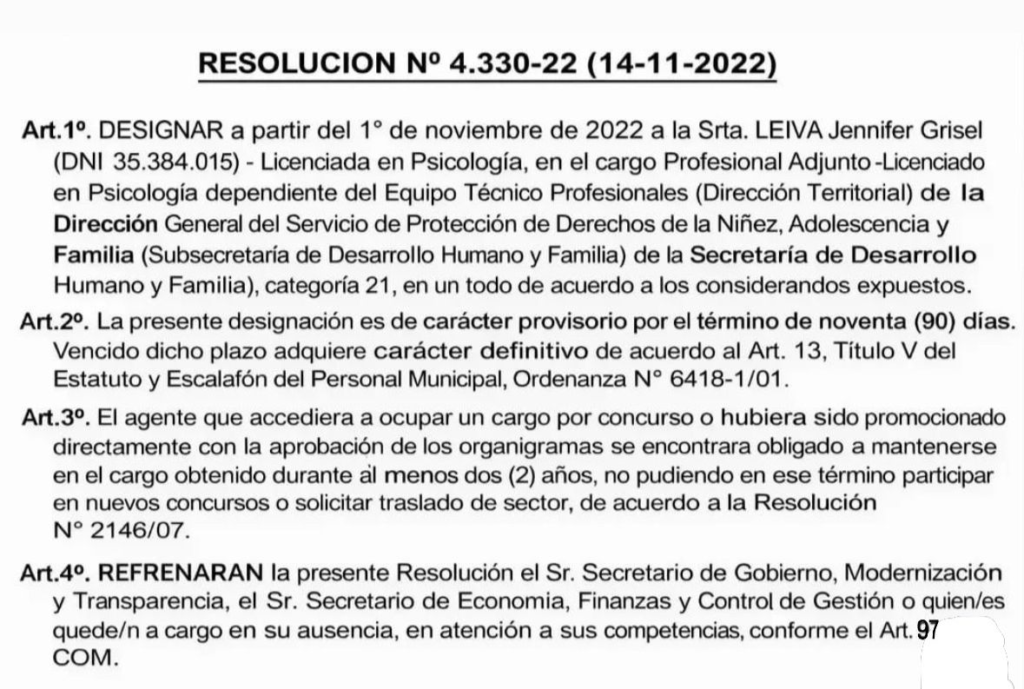 Leiva entró a trabajar al Servicio de Protección de Derechos bajo el presupuesto y la estructura política de la gestión Luque, su designación se dió en 2022 avalada por el intendente y actual diputado nacional de Unión por la Patria, el Boletín Oficial N° 170 detalla la composición del gabinete bajo el mando de Juan Pablo Luque. Cualquier designación técnica en el área de Niñez (que depende de la Secretaría de Desarrollo Humano y Familia) debe llevar su firma o la de sus secretarios directos para ser válida.
