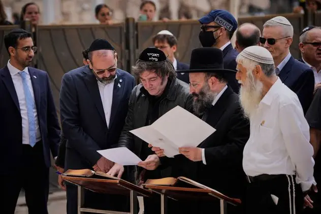 Apenas arribado a Israel, Milei visitó el Muro de los Lamentos, uno de los sitios más sagrados del judaísmo, donde rezó y firmó el libro de visitas acompañado por autoridades locales. Este gesto marcó el tono de una agenda atravesada por lo espiritual, lo cultural y lo político.