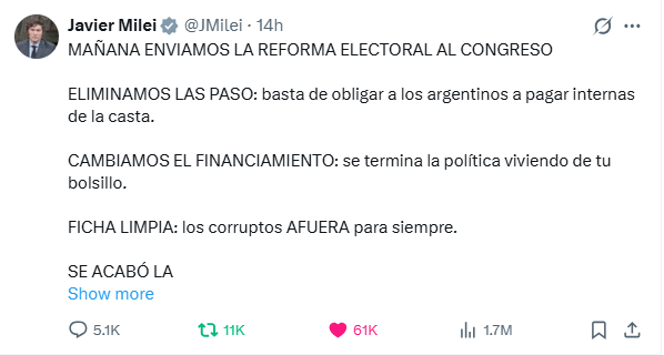 El anuncio fue realizado a través de sus redes sociales, en un mensaje contundente que marca el tono de la iniciativa: “Se acabó la impunidad. Se acabó la joda”. Con esta reforma, el Gobierno busca instalar un cambio estructural que, según sostiene, apunta a reducir el gasto público, transparentar la política y devolverle poder de decisión a los ciudadanos sin obligarlos a financiar disputas internas partidarias.