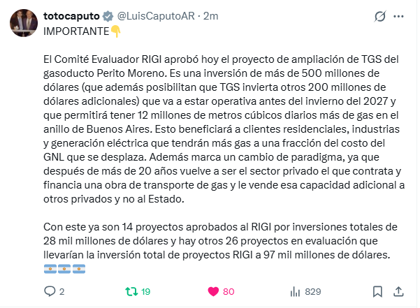 El anuncio fue destacado por el ministro de Economía, Luis Caputo, a través de sus redes sociales, donde remarcó la relevancia del proyecto no solo por su impacto económico sino también por el cambio estructural que implica en la forma de financiar y ejecutar obras de infraestructura energética en la Argentina.